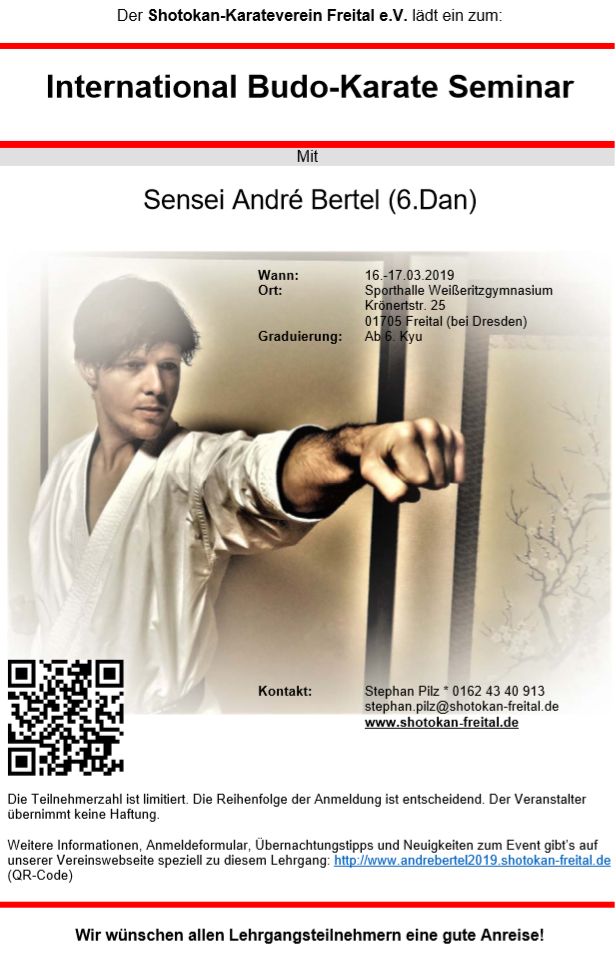 Auch im kommenden Jahr findet wieder ein Lehrgang mit André Bertel statt. Dieser Lehrgang ist für alle Karateka ab dem 6. Kyu zu empfehlen. Daher möchten wir unsere Mitglieder dazu anhalten, eine Teilnahme in Betracht zu ziehen.
